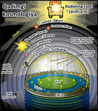Yer ustma-ust taxlangan yetti yassi diskdan, osmon esa bir-biriga kiydirilgan yetti gumbazdan iborat. Quyosh, Oy, yulduz va sayyoralar kabi osmon jismlari esa mayda chiroqlar bo'lib, eng ichki gumbazga taqilgan. Quyosh loyqa suvga tushib, yer ostiga kirib ketsa, Allohdan ertaga yana qaytib chiqishga ruxsat so'raydi. Jannat tepadagi gumbazlarda, do'zax esa yer ostida joylashgan.