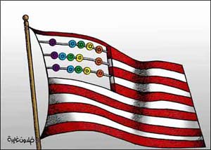 20 KB | On the right: the "Mossad" and the CIA are cooking the "September 11th events". They give the food (representing the events) to the world, while America is standing behind, ordering the world: "Eat!" The world is responding with humility: "OK". Al-Wata | 1 |