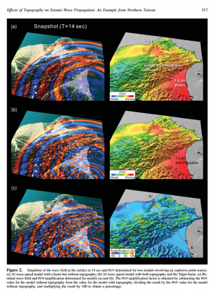 - ↑ Fig. 2 from Lee, Shiann-Jong & Komatitsch, Dimitri & Huang, Bor-Shouh & Tromp, Jeroen. (2009). Effects of Topography on Seismic-Wave Propagation: An Example from Northern Taiwan. Bulletin of the Seismological Society of America. 99. 10.1785/0120080020.