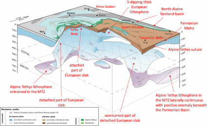 - ↑ Fig. 11 in Handy, M. R., Schmid, S. M., Paffrath, M., Friederich, W., and the AlpArray Working Group: Orogenic lithosphere and slabs in the greater Alpine area – interpretations based on teleseismic P-wave tomography, Solid Earth, 12, 2633–2669, https://doi.org/10.5194/se-12-2633-2021, 2021