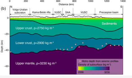 = | [[File:Ural_gravity_model.png|alt=|thumb|425x425px|Gravity model of a cross section from part of the Ural mountain range (note the exaggerated vertical dimension) by Ognev et. al. (2022). They explain: "Satellite gravity gradient data was applied to determine the Moho depth for the area [i.e. the lower boundary of the crust] ... The Moho discontinuity obtained from the gravity inversion was consequently modified and complemented in order to define a complete 3D crustal model by adding information on the sedimentary cover, upper crust, lower crust, and lithospheric mantle layers in the process of forward gravity modelling, where both seismic and gravity constraints were respected."<ref>Ognev, I., Ebbing, J., and Haas, P.: [https://se.copernicus.org/articles/13/431/2022/ Crustal structure of the Volgo–Uralian subcraton revealed by inverse and forward gravity modelling], Solid Earth, 13, 431–448, https://doi.org/10.5194/se-13-431-2022, 2022. (Open access)</ref>|center]] | ||