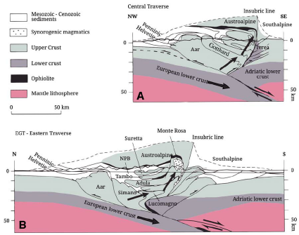[[File:Alps_crustal_cross_section.png|alt=|thumb|425x425px|Two cross sections illustrating part of the Alps by Moores et al. (2013)<ref>Moores, Eldridge & Yıkılmaz, M. & Kellogg, Louise. (2013). [https://www.researchgate.net/publication/284224939_Tectonics_50_Years_after_the_Revolution Tectonics: 50 Years after the Revolution] 10.1130/2013.2500(10). pp. 347-8</ref>|center]] | |||