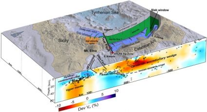 [[File:Calabro-IonianSubductionZone.jpg|alt=|thumb|425x425px|Model sketch showing the subduction zone near Sicily based on seismic tomography data by L. Scarfi et. al. (2018)<ref>Fig. 7 in Scarfì, L., Barberi, G., Barreca, G. et al. [https://www.nature.com/articles/s41598-018-23543-8 Slab narrowing in the Central Mediterranean: the Calabro-Ionian subduction zone as imaged by high resolution seismic tomography] Sci Rep 8, 5178 (2018). https://doi.org/10.1038/s41598-018-23543-8</ref>)|center]] | |||