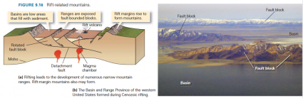 === | The diagrams shown below from Stephen Marshak's detailed university textbook, ''Essentials of Geology'', illustrate major types of mountain formation resulting from tectonic activity: Subduction of oceanic plates underneath continental plates; collision of continental plates; and rifting (separation) of plates which can cause fault block mountains.[[File:MarshakSubduction.png|alt=|thumb|425x425px|left|Illustration of mountain formation due to subduction of an oceanic plate.<BR />Fig. 9.16 in Stephen Marshak, ''Essentials of Geology'' Fourth Edition, 2013, New York: W. W. Norton & Company, p. 280]][[File:MarshakFaultBlock.png|alt=|thumb|425x425px|left|Illustration of mountain formation due to rifting.<BR />Fig. 9.18 in Stephen Marshak, ''Essentials of Geology'' Fourth Edition, 2013, New York: W. W. Norton & Company, p. 281<BR />It is apparent that fault block mountains, including tilted (or rotational) fault blocks form mountain ranges without generating crustal roots as their formation does not involve an increase in material, and hence no isostatic rebalancing.]][[File:MarshakContinentalCollisions.png|alt=|thumb|425x425px|center|Illustration of mountain formation due to continental plate collision.<BR />Fig. 9.17 in Stephen Marshak, ''Essentials of Geology'' Fourth Edition, 2013, New York: W. W. Norton & Company, p. 281<BR />Note that while this type of mountain formation results in crustal "roots" (thickening), the increased crustal thickness extends all along the length of the mountain range, so does not resemble a peg.]] | ||
