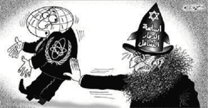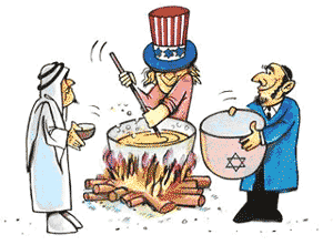 12 KB | The cartoon's headline: "The big Middle East's plan." From right to left: stage 1: America is inserting "the Middle East countries" to the blender; stage 2: the countries are being mashed in the blender; stage 3: the mash is given to the Jewish dog. | 1 |