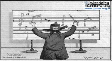 19 KB | Jews are shown to be orchestrating events through violence. Bullet holes and blood make up the notes. Al Hayat Al Jadida, May 8, 2005 | 1 |