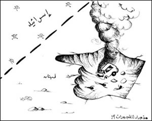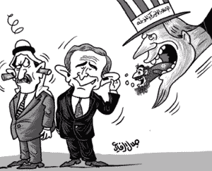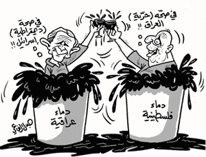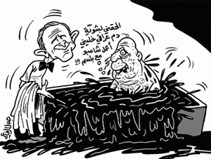 14 KB | Sharon and Bush are dipping into Palestinian and Iraqi blood (respectively). Sharon is drinking "to the life (freedom) of Iraq, and Bush is drinking "to the life (democracy) of Israel". Ar-Rai, April 8, 2004 | 1 |