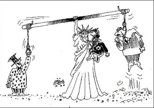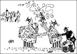 25 KB | On the left, the donkey is representing "the Democratic Party"; On the right, the (Jewish) elephant is representing "the Republican Party", who is crushing "the world". Bush is saying: "The world is now becoming safer". Akhbar al-Khalij, July 28, 2004 | 1 |