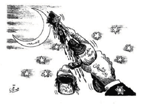 The Jewish hand, representing "The devil's hand", is holding "ignorant extremists", who are trying to paint the Islam's moon with "accusations of terror". Akhbar al-Khalij, July 18, 2004