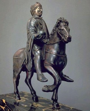 Carolus Magnus (Emperor of France and Western Germany) (742-814) represented on a horse, holding a globe. Ninth century sculpture.