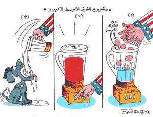 The cartoon's headline: "The big Middle East's plan." From right to left: stage 1: America is inserting "the Middle East countries" to the blender; stage 2: the countries are being mashed in the blender; stage 3: the mash is given to the Jewish dog.
