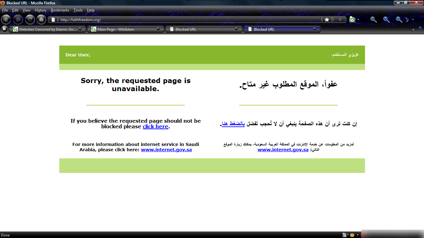 | current | 07:01, 3 August 2011 | Error creating thumbnail: Unable to save thumbnail to destination | 1,366 × 768 (91 KB) | Sanitarium (talk | contribs) | faithfreedom.org is currently blocked in KSA. screenshot taken 3rd August, 2011. |