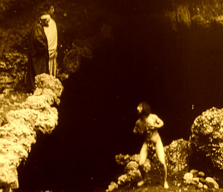 A scene from the 1911 Italian silent film L'Inferno, showing Muhammad on the right with his entrails hanging out.