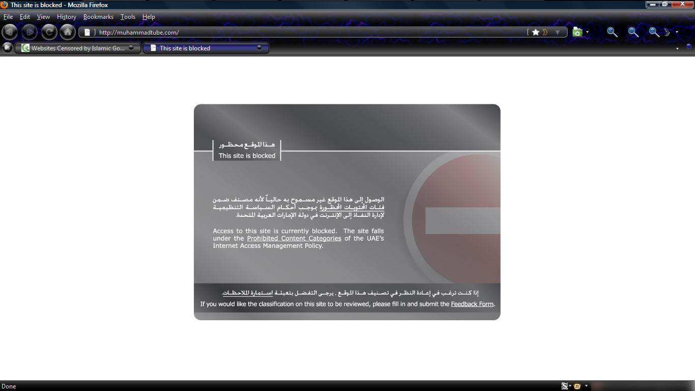 muhammadtube.com is currently blocked in UAE. screenshot taken 3rd August, 2011.