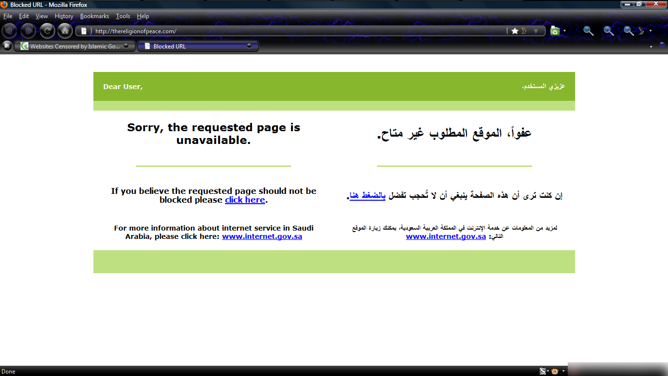thereligionofpeace.com is currently blocked in KSA. screenshot taken 3rd August, 2011.