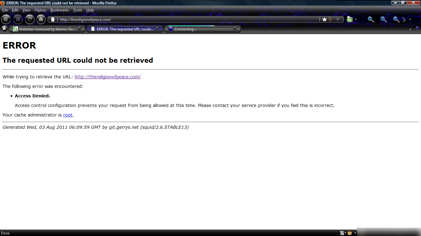 thereligionofpeace.com is currently blocked in Pakistan. screenshot taken 3rd August, 2011.