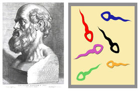Hippocrates (d. 375 BCE) around the same time taught that semen comes from all the fluid in the body, diffusing from the brain into the spinal marrow, before passing through the kidneys and via the testicles into the penis.[8]